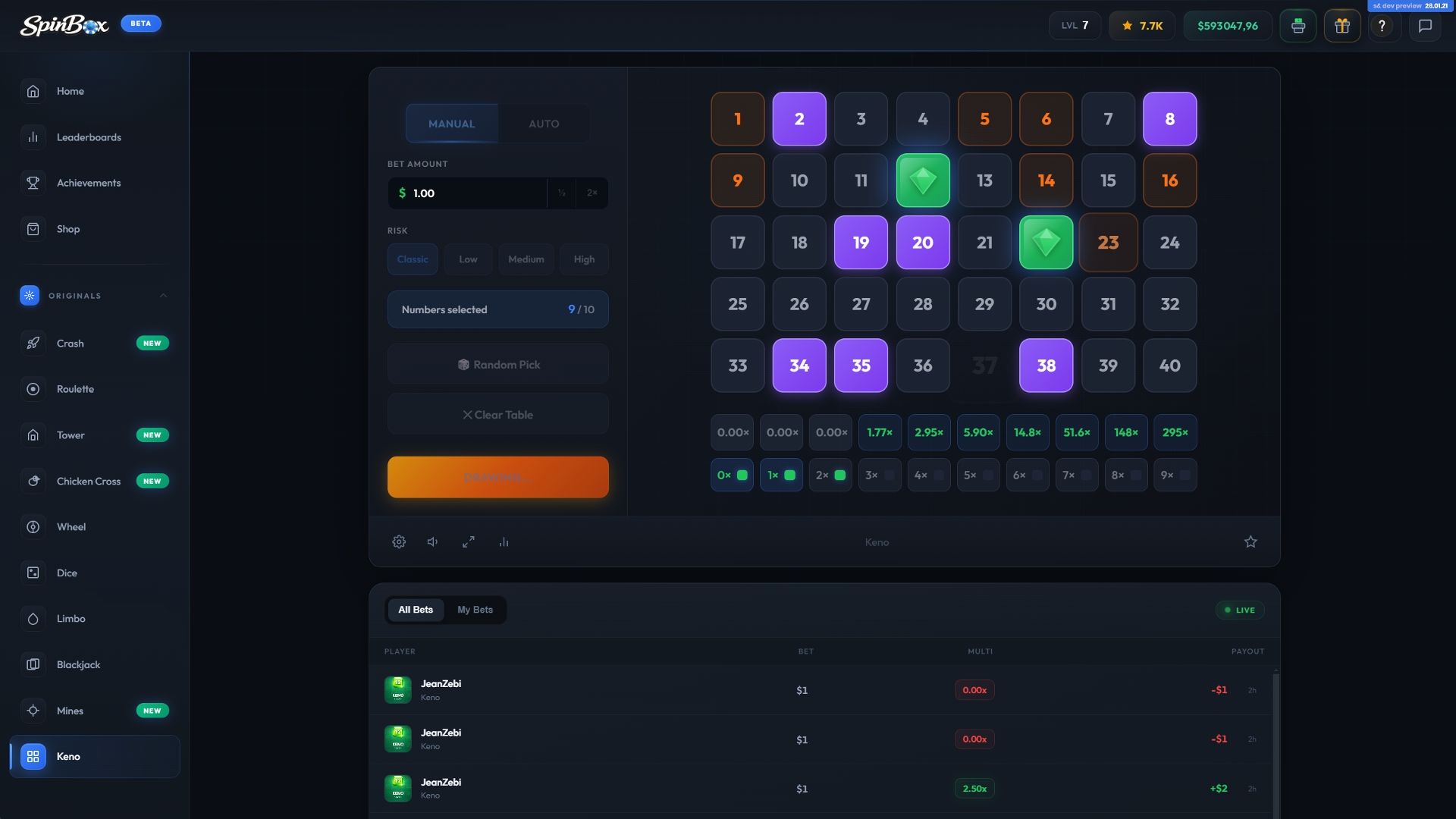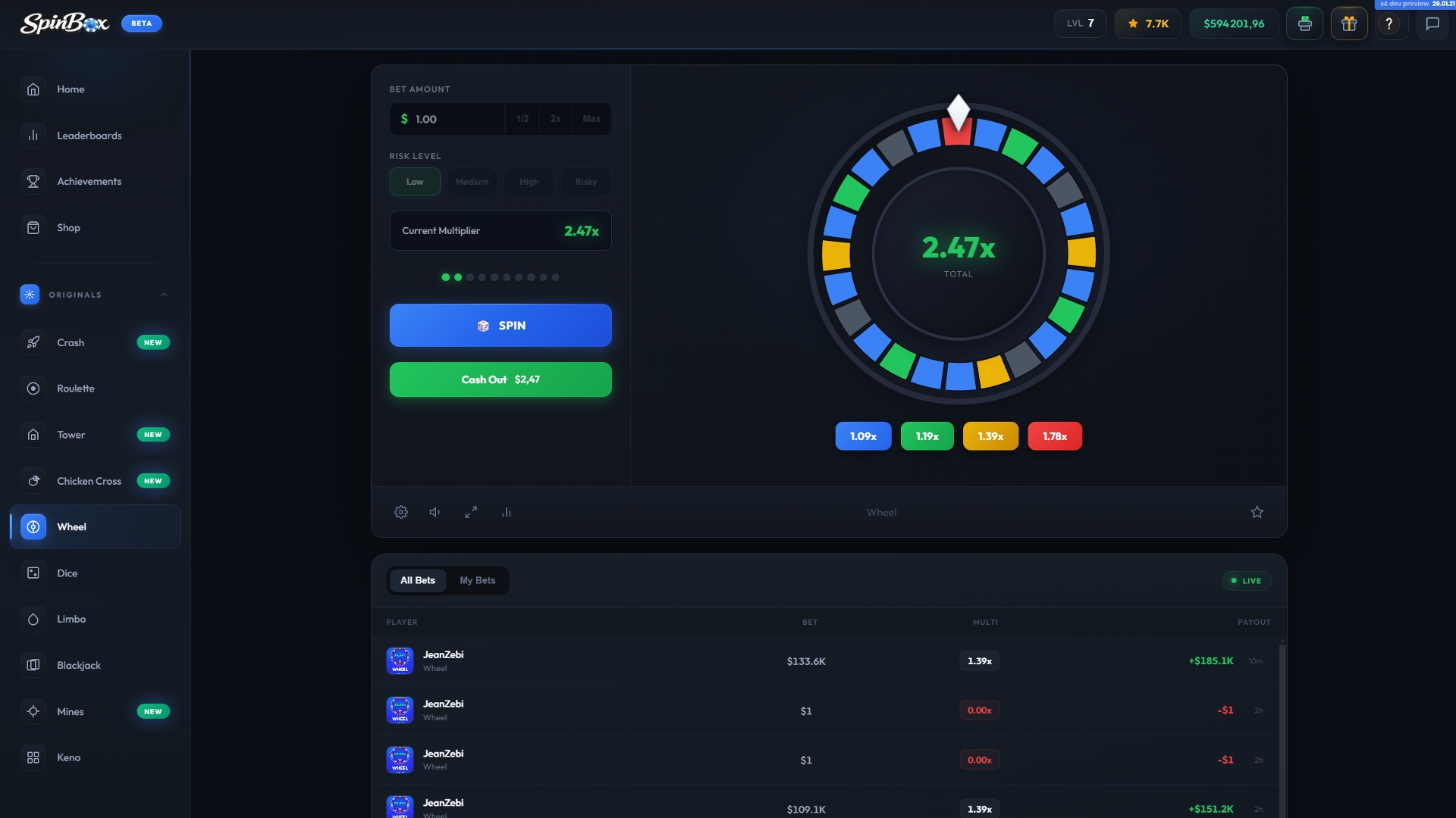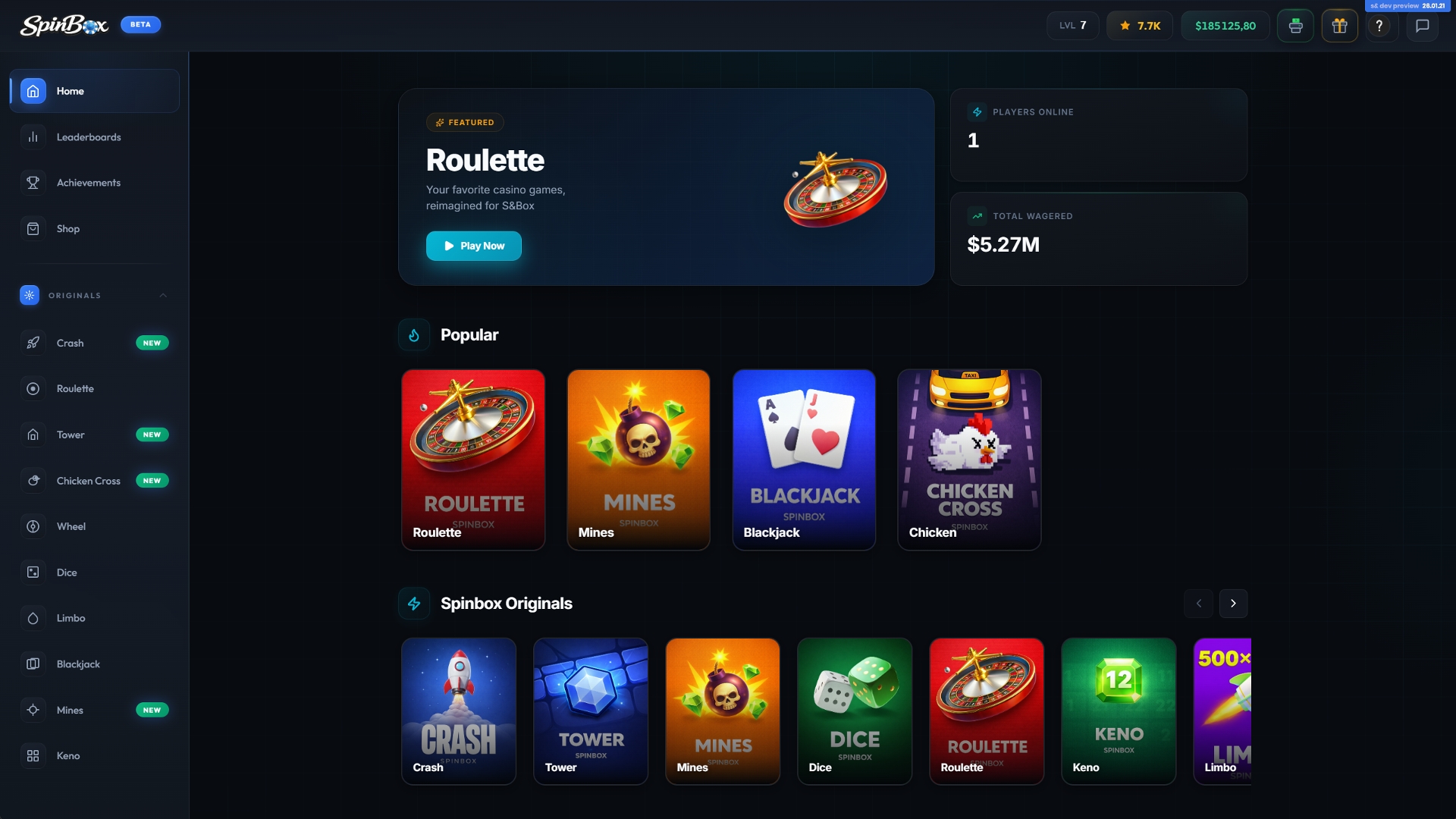 Spinbox is a casino platform featuring 10+ games, designed for both quick sessions and extended play. It offers a balanced mix of classic casino experiences and modern, fast-paced games, with more content actively in development and additional games coming soon.