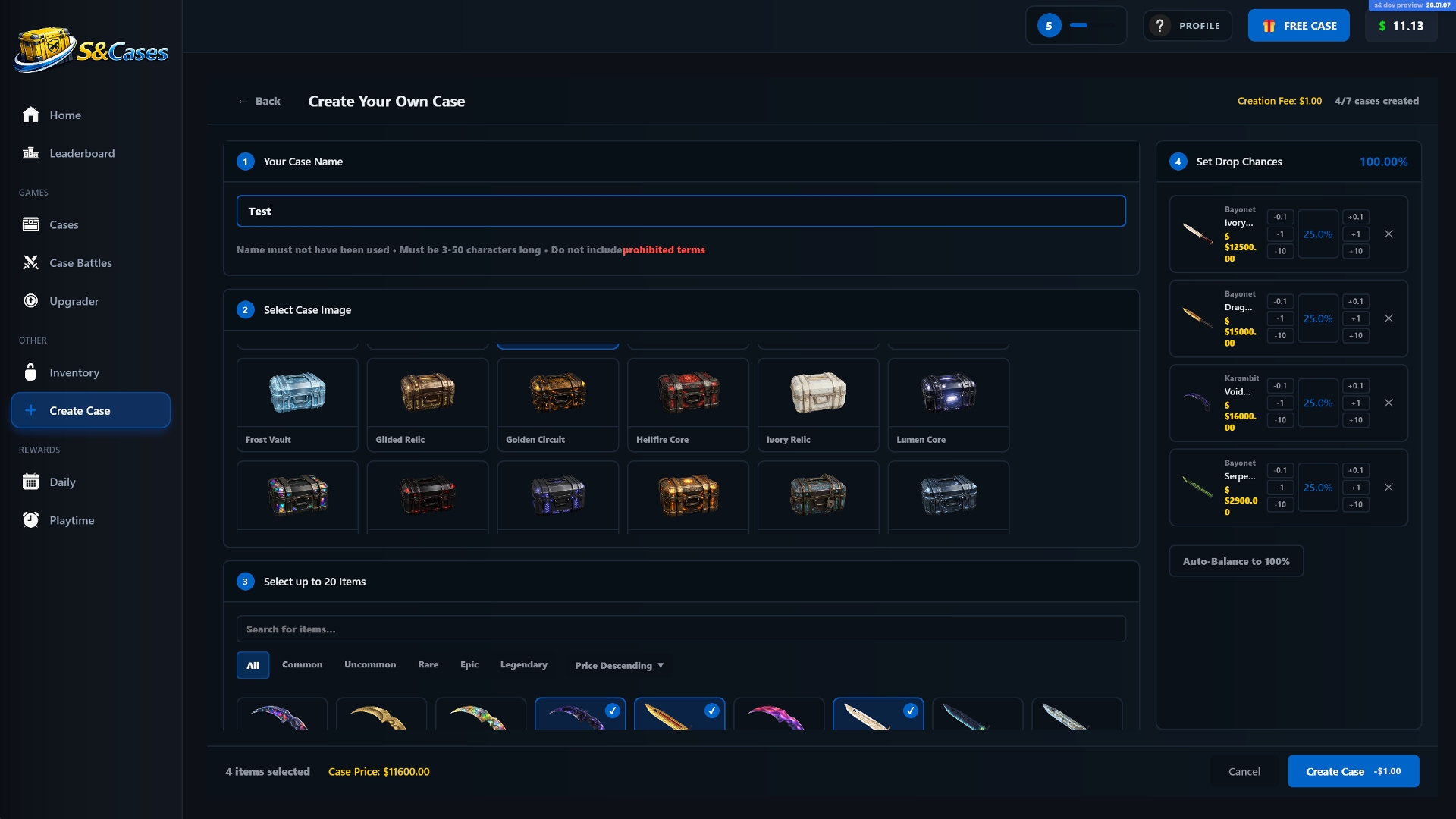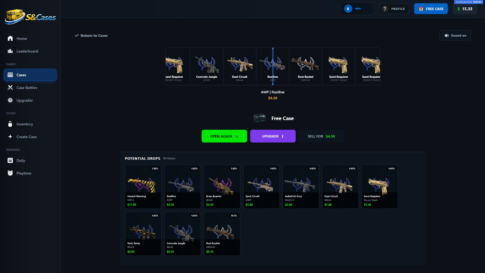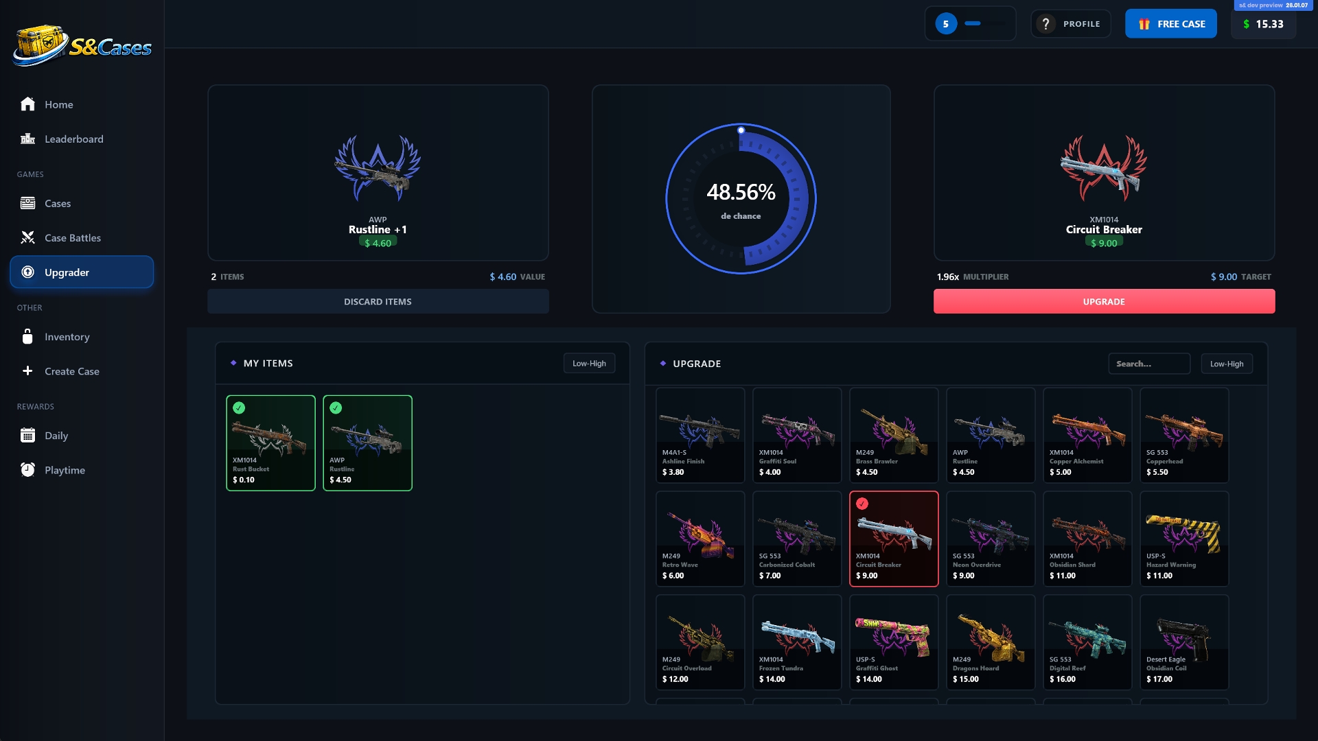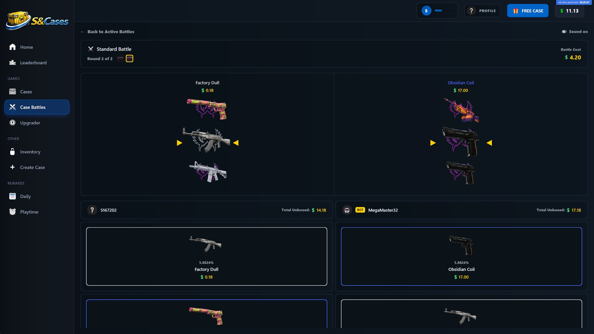 If you don’t want to play alone, there’s a case battle mode where two to four players open the same cases at the same time. Whoever ends up with the highest total value wins. There’s also an upgrader system where you can risk lower-tier skins for a chance to get higher-value rewards.