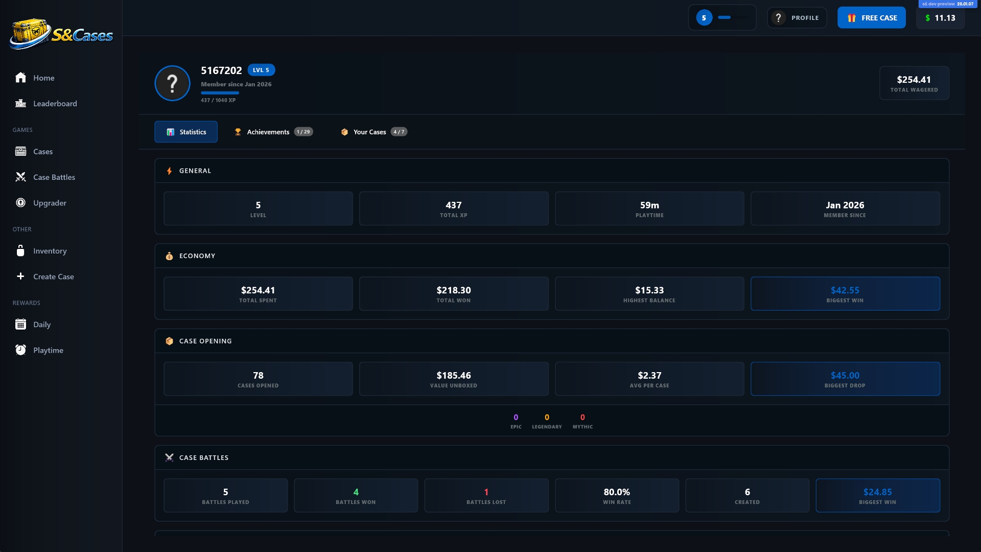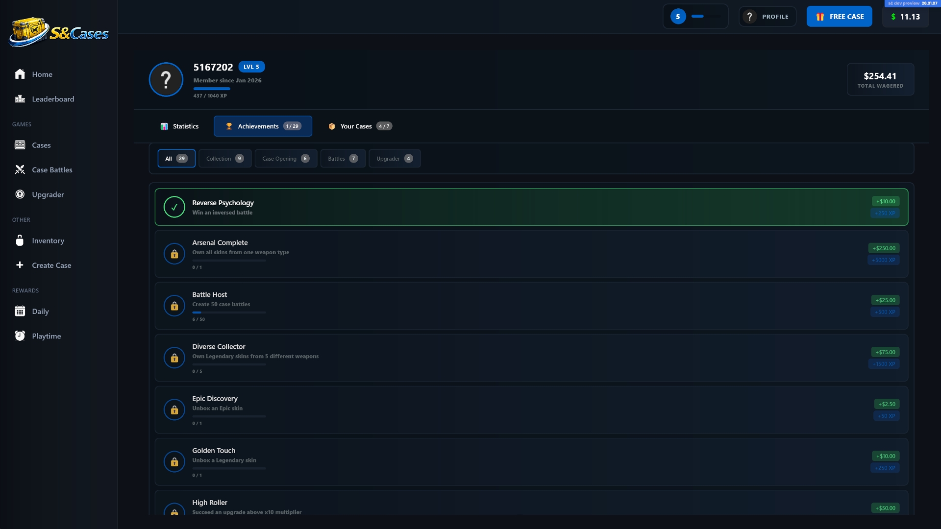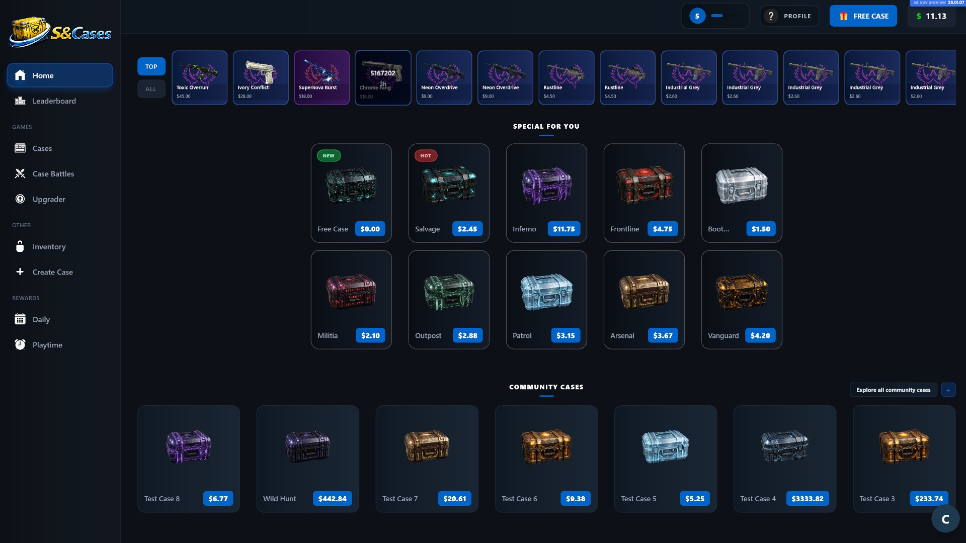 The game includes a 100-level progression system. You earn XP just by opening cases, and as you level up you unlock helpful features like faster openings, bulk opening, and access to community-created cases.