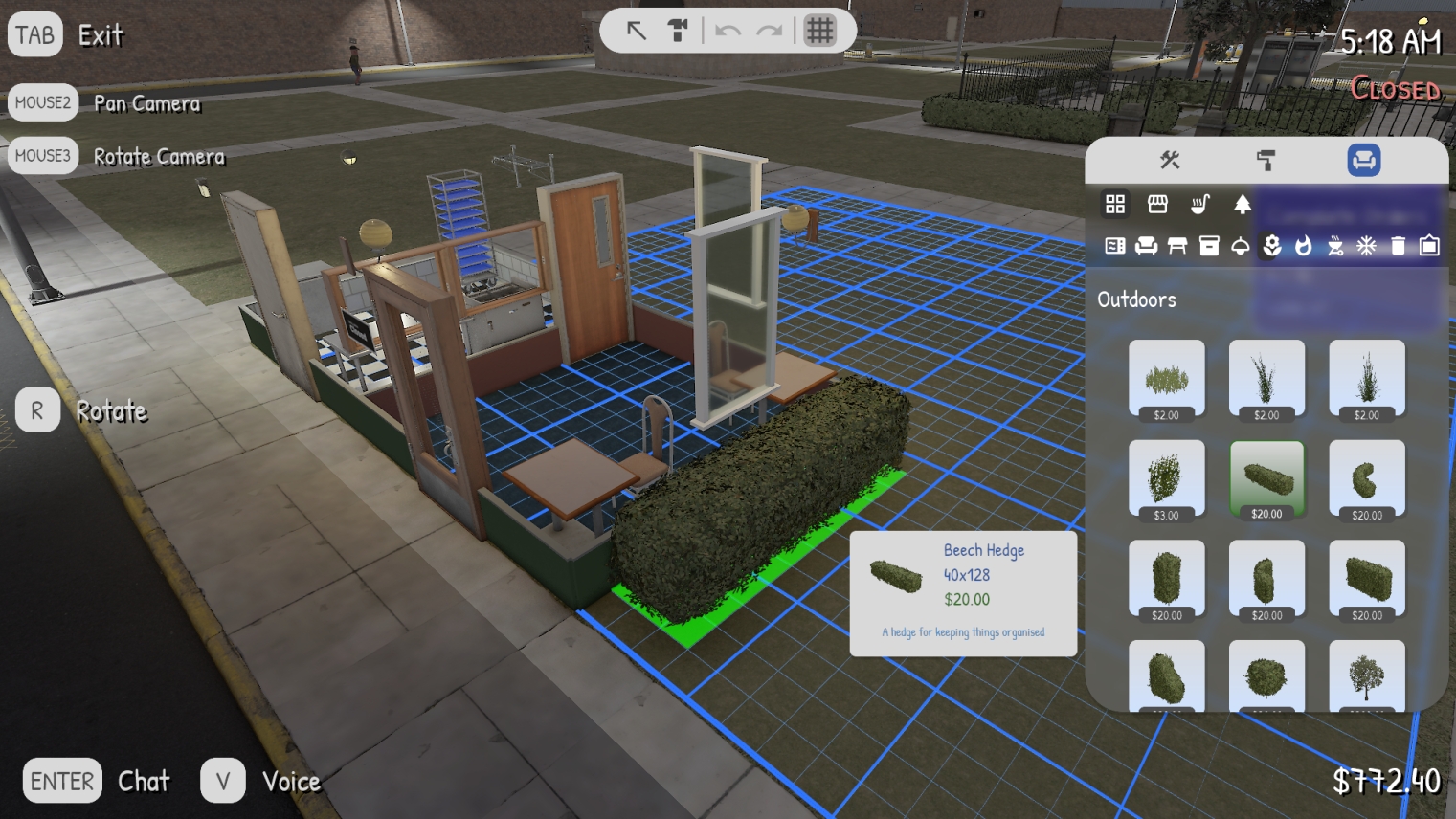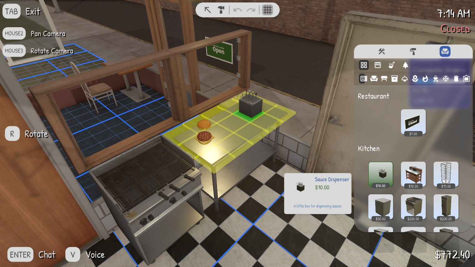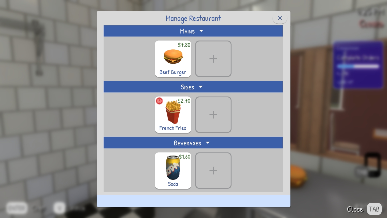 Enter build mode to customise your restaurant as you desire. Place grills, tables, fridges, booths, and more across a flexible grid system. Swap out the flooring, walls, and arrange the furniture until every detail is exactly how you want it. Your restaurant, your way.