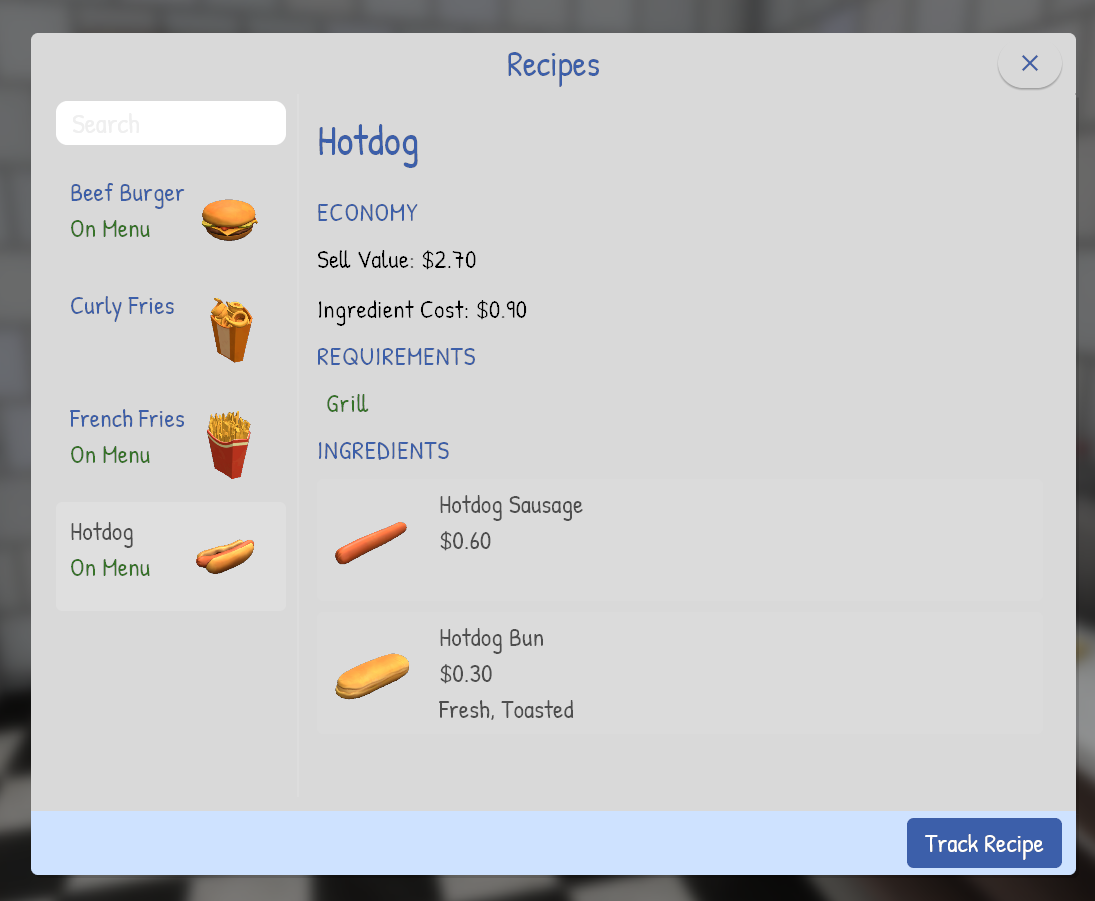 If you don't meet the requirement to serve the meal, you will be shown a warning, and customers won't order it until it is resolved. In the example below, I don't meet the requirement as I am missing a fryer. The recipe app is now online, allowing you to view the ingredients for recipes and track your progress through the UI.