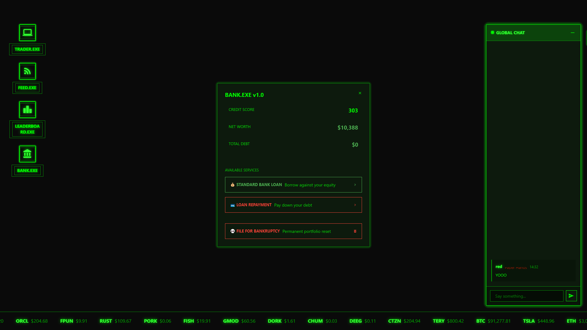 To start, I’ve completely removed the incremental clicker portion of the game and the hourly free spinner. I initially added this to both give players a way to avoid going broke and also for player retention but I realize now that the middleground I was trying to achieve of meme game and simulator just doesn’t work. Its a gimicky player retention mechanic and I should have spent more time thinking about the overall gameplay loop. So I’ve decided to lean hard into the simulator. I’ve replaced it with a bank, including loans credit score, and bankruptcy to start heading in the simulator direction. Loans have an interest applied every 24 hours but this is subject to change, I have to see what people think of it first. There is also a loan cooldown of 45 minutes so you can not just spam repay loans to increase your credit score.